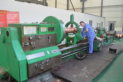 电解铜(原料)→熔化→炉前分析合格→铸锭→炉后成分分析,无损检测,表面外观,尺寸检测→成品铸锭→锻造前外观表面,尺寸检查验收→并做好记录→制定锻造工序生产工艺方案→锭坯加热、保温 到合适温度→锻压工序→墩粗(2—3次)→冲孔→扩孔(3—4次)→ 扒长(12—16次)→测量锻坯尺寸若合格进入下一工序(若有差异,需经修复到合格后,进入下一工序)→坯料进入粗车工序→检验尺寸并做好记录→制定粗车加工生产工艺→粗车筒体、法兰、底垫→粗车尺寸需符合经多年生产实践经验总结的理结构方式与余量尺寸(这样结构不但增加法兰的钢性,同时减少其因焊接产生变形的可能性)→装配→焊接→半精车后→检查焊缝是否有缺陷→若没外观缺陷→无损探伤(检查焊缝内部)检查并做好记录→精车生产工艺确定→成品精车→成品精车→无损探伤、打压→成品、滚压、磨光→成品检测,并做记录→清洁包装。